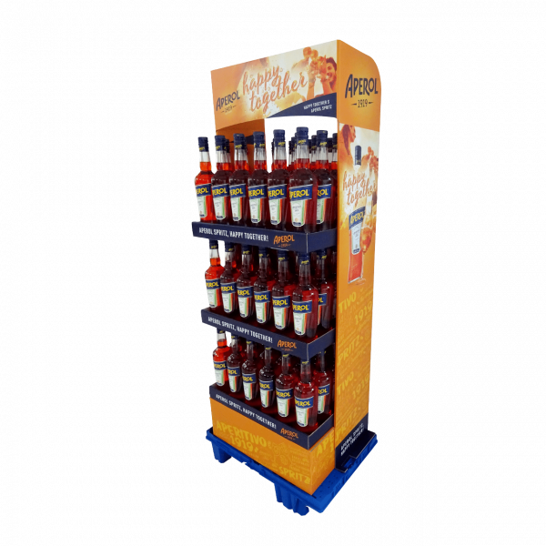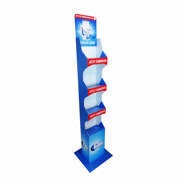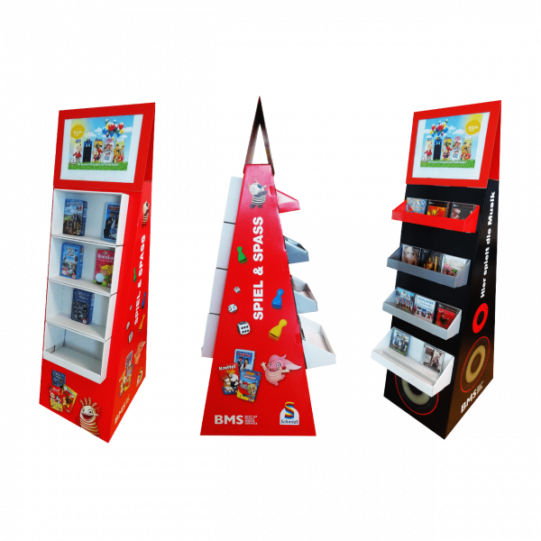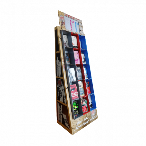 Diese Displayvariante wird von uns so konzipiert, dass das jeweils präsentierte Produkt nicht mittragend ist. So bleibt die Stabilität der Regalböden und Präsentationsoptik auch weiterhin bestehen, wenn ein Fach leer ist. Je nach Wunsch kann man das Verkaufsdisplay auch so gestalten, dass dem Kunden Zugriff von beiden Seiten gegeben wird.